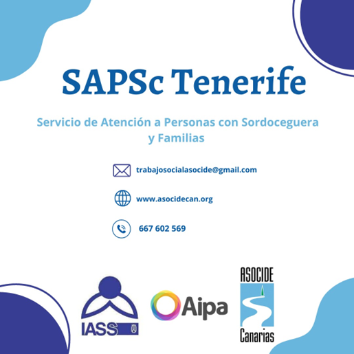 Un año más, desde el mes de enero y a lo largo del 2025, estará en funcionamiento el Servicio de Atención a Personas con Sordoceguera y Familias - SAPSc. Gracias a la financiación del Instituto de Atención Social y Sociosanitaria IASS, dentro del Anillo Insular de Políticas Sociales, podremos dar atención especializada a las personas con sordoceguera y sus familias en numerosos municipios de la isla de Tenerife.